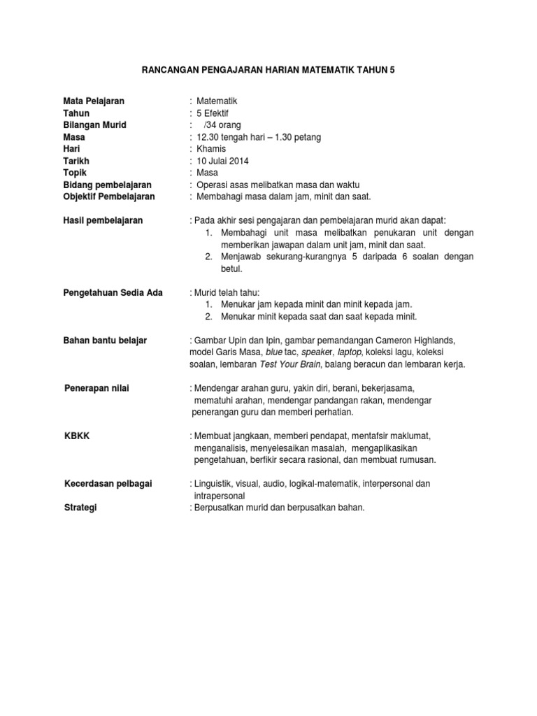 Rancangan Pengajaran Harian Bahagi Panjang Matematik Tahun 5 Pdf